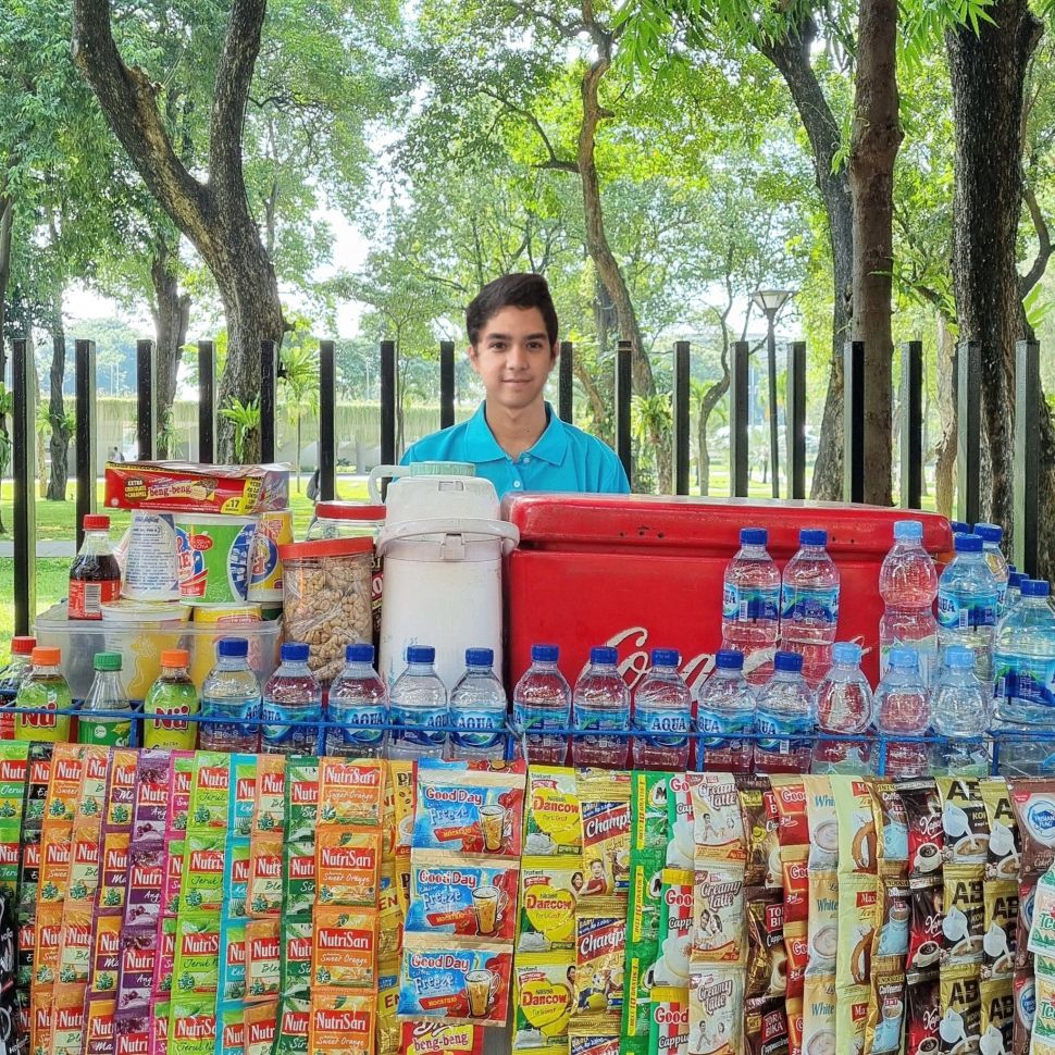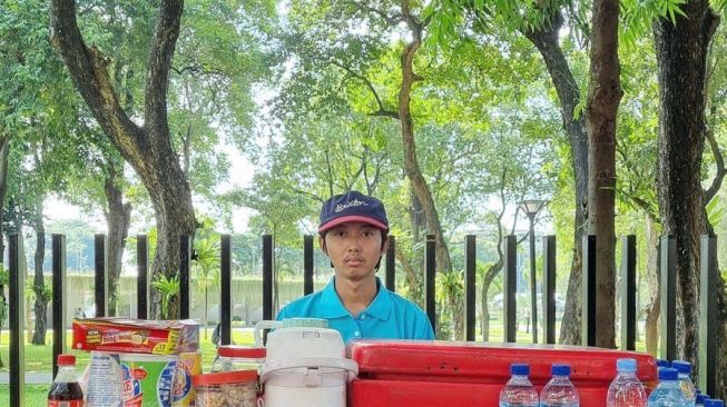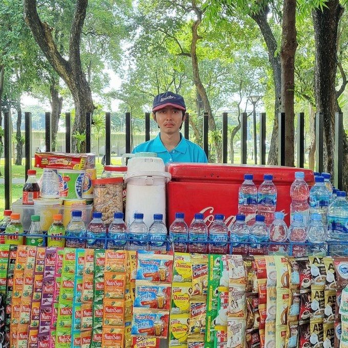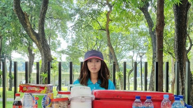 Pada Sabtu (28/05/22) ia mengunggah potret dirinya yang sedang berjualan berbagai jenis minuman di gerobak.
