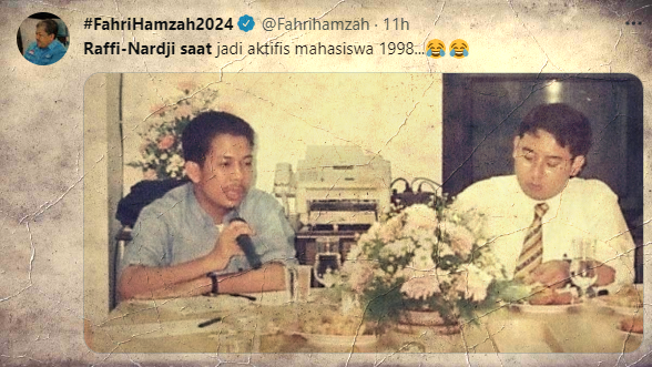 “Raffi-Nardji saat jadi aktivis mahasiswa 1998…,” cuit Fahri Hamzah mengiringi foto tersebut, sambil menyematkan dua emoji tertawa.