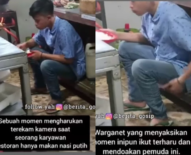 Saat di-zoom, pria yang bekerja di restoran itu rupanya hanya makan nasi putih tanpa adanya lauk.