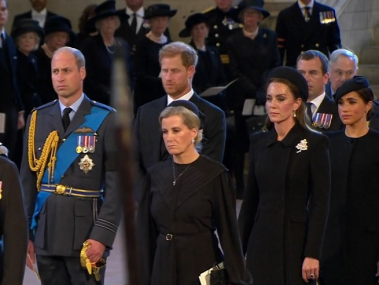 Dalam prosesi tersebut, Harry mengenakan setelan jas yang dihiasi sejumlah medali. Sementara Meghan Markle memakai gaun mantel ebony yang ramping dan topi kotak hitam berhiaskan kerudung berjaring yang elegan. Ia melengkapi penampilannya dengan sepasang anting mutiara. Mutiara tersebut sering disebut sebagai “perhiasan duka”, sebuah tradisi yang berasal dari era Ratu Victoria.