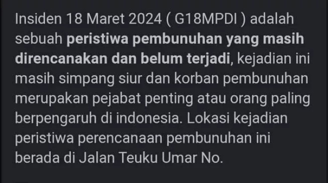 “Insiden 18 Maret 2024 (G18MPDI) adalah sebuah peristiwa pembunuhan yang masih direncanakan dan belum terjadi, kejadian ini masih simpang siur dan korban pembunuhan merupakan pejabat penting atau orang paling berpengaruh di Indonesia.