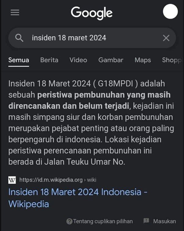Akun tersebut menunjukkan tangkapan layar hasil pencarian dengan kata kunci insiden 18 maret 2024 di Google. Hasil pencarian menunjukkan artikel dari Wikipedia.