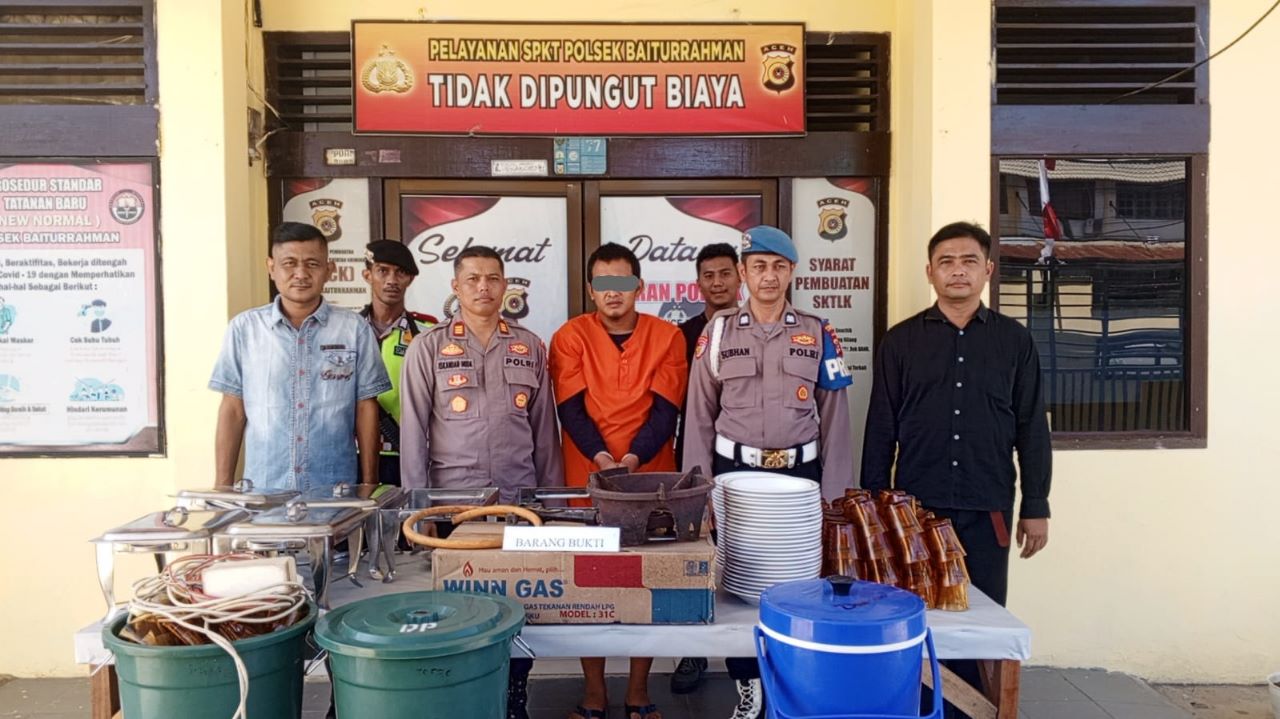 Pelapor dalam kasus ini adalah Ketua Kaum Ibu Dusun Pahlawan, Ona Marlina. Dari penangkapan tersebut, polisi berhasil mengamankan sejumlah barang bukti yang terdiri dari 5 lusin gelas duralex, 6 unit prasmanan, 5 lusin piring indo keramik, 1 unit kompor, dan 2 ember warna hijau.