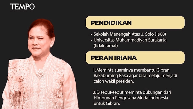 Kepada Tempo, dua kerabat dekat Jokowi dan Iriana yang ditemui terpisah bercerita bahwa ibu negara beberapa kali memberikan sinyal ihwal karier Politik Gibran. Iriana disebut meminta dukungan keluarganya agar Gibran bisa masuk Istana Wakil Presiden. Bahkan ia mengarahkan familinya untuk memilih Gibran sebagai pasangan calon presiden yang didukung Jokowi, yakni Prabowo.