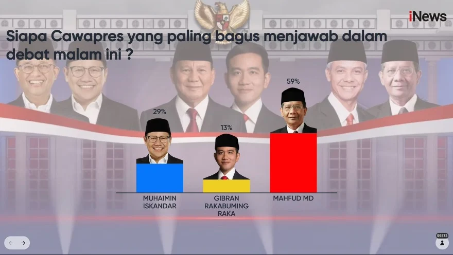 Hasilnya, sebanyak 59 persen responden menyebut Mahfud MD adalah Cawapres yang menjawab paling baik. Diikuti oleh Cawapres Muhaimin Iskadar yang mendapat 29 persen. Sedangkan Cawapres Rakabuming Raka berada pada posisi buncit dengan 13 persen.