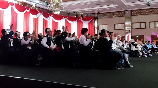 BANDA ACEH – Suporter calon presiden dan wakil presiden (capres-cawapres) nomor urut 3 Ganjar Pranowo–Mahfud MD bertepuk tangan terhadap jawaban cawapres nomor urut 1, Muhaimin Iskandar.