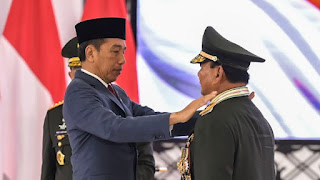 Jokowi memberikan gelar istimewa bintang empat atau jenderal kehormatan kepada Prabowo di Markas Besar Tentara Nasional Indonesia, Cilangkap, Jakarta Timur.