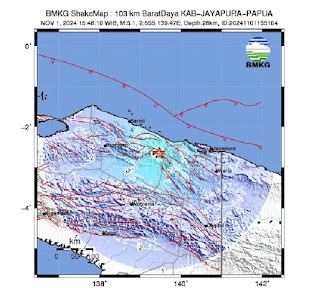 BANDA ACEH – Gempa berkekuatan magnitudo 5,1 mengguncang Distrik Bonggo di Kabupaten Sarmi, Papua, pada Jumat sore pukul 15.48 WiB, 1 November 2024. Direktur Gempa Bumi dan Tsunami Badan Meteorologi, Klimatologi, dan Geofisika (BMKG), Daryono, mengatakan lindu kategori dangkal itu dipicu aktivitas sesar aktif.