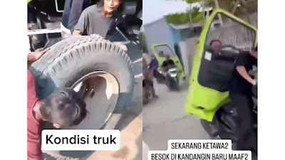 Dalam video yang diunggah @medsos_rame terlihat para warga ‘mempreteli’ roda dan pintu truk yang kemudian dibawanya komponen truk itu menggunakan sepeda motor.