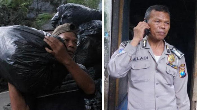 Di jam kerja, pria berusia 57 tahun berseragam polisi namun di luar waktu itu ia mengumpulkan rongsokan untuk dijual.