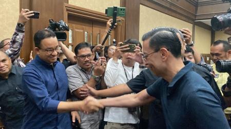 Terlihat Anies sudah menunggu kedatangan Tom. Keduanya lalu saling bersalaman hingga melempar senyum.