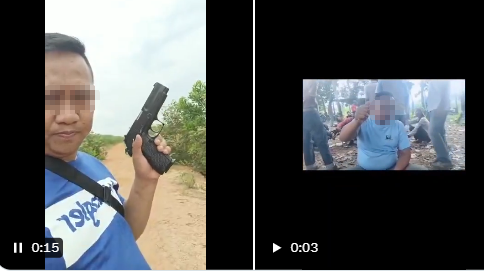 Pada video pertama terlihat pria bertubuh gempal dengan gaya potongan rambut cepak itu tengah memarkean senjata api (senpi) sembari menembakinya berulang kali ke arah pohon.