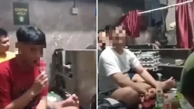 Tampak pula sebuah botol bekas yang dipasangi sedotan berwarna putih, menyerupai bong atau alat isap sabu. Ada juga seorang pria yang duduk di sudut ruangan sambil memegang handphone di telinganya.