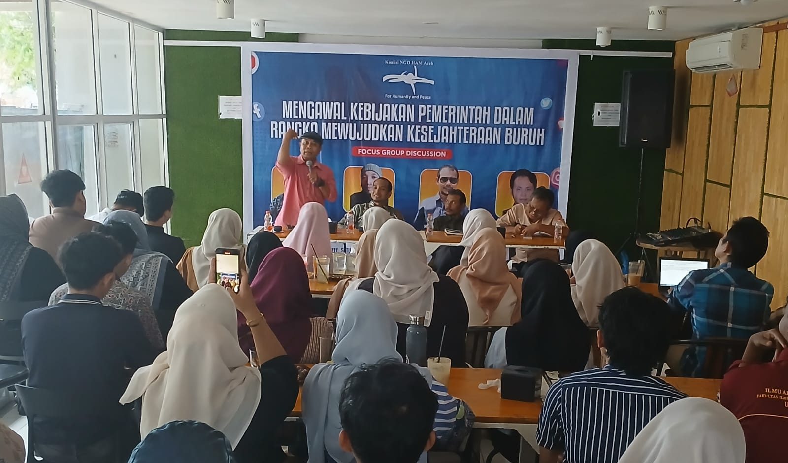 Diskusi tersebut diikuti oleh sekitar lima puluh mahasiswa dari berbagai universitas di Aceh. Hadir pula dua narasumber lainnya, yakni Pengamat Politik dan Ekonomi Aceh, Taufiq A. Rahim, serta Ketua DPW Federasi Serikat Pekerja Metal Indonesia (FSPMI) Aceh, Habibi Inseun.