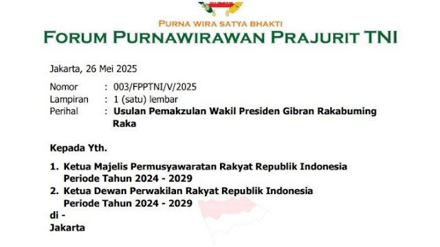 Kali ini Forum Purnawirawan Prajurit TNI secara resmi melayangkan surat permohonan pemakzulan Gibran kepada Majelis Permusyawaratan Rakyat (MPR) dan Dewan Perwakilan Rakyat (DPR) dan Dewan Perwakilan Daerah (DPR) RI.