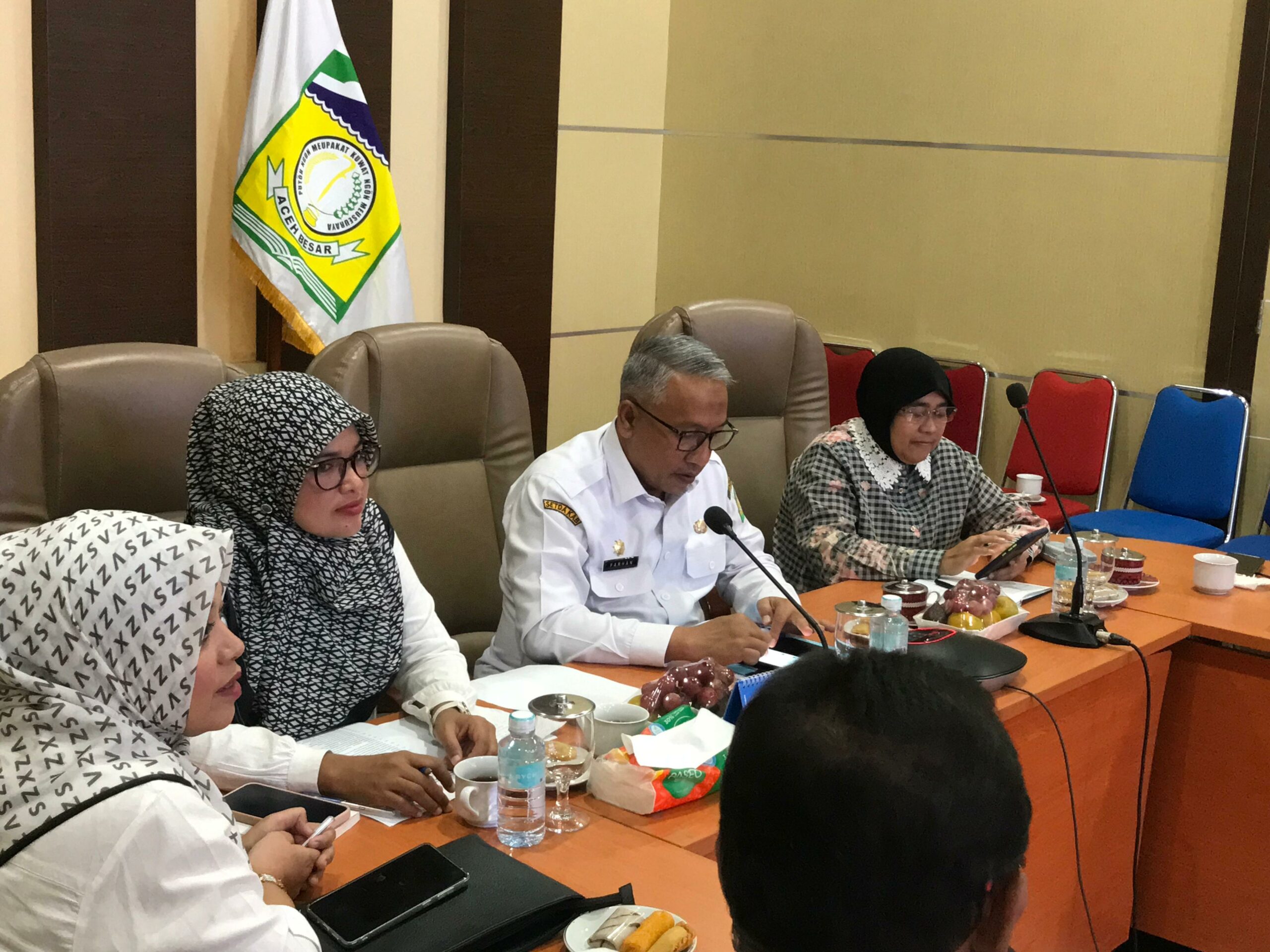 Tim Kemenkes disambut oleh Asisten I Sekdakab Aceh Besar, Farhan AP didampingi Plt Kepala Dinas Kesehatan, Nelli Ulfiati. Turut hadir dalam jajaran Kepala OPD terkait di antaranya Bappeda, Dinas Lingkungan Hidup, Dinas PUPR, Dinas Pendidikan dan Kebudayaan, Satpol PP-WH, BPBD serta PDAM Tirta Mountala.