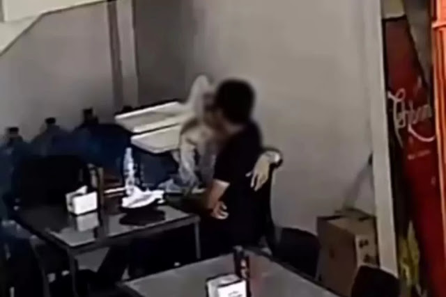 Dalam rekaman CCTV yang viral, tampak seorang perempuan berhijab dan pria berkaus hitam polos awalnya berciuman mesra di area restoran.