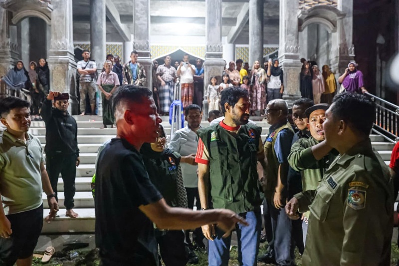 Mualem bersama rombongan melanjutkan peninjauan ke titik pengungsian di Masjid Meunasah Manyang, Meureudu. Ia menyerahkan bantuan tanggap darurat berupa kebutuhan pokok bagi para pengungsi.